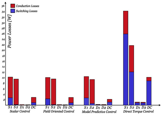 As presented in Figure 21, independent of the control strategy, power losses are concentrated in and devices, while losses in and have a negligible contribution to losses. On the other hand, losses on clamping devices will depend on the control strategy; SC, FOC, and MPC (with the limitation of switching frequency) exhibit similar amount of total losses, while, DTC exhibits the highest losses, comparable to the losses of the switching devices and in SC, FOC, and MPC schemes.