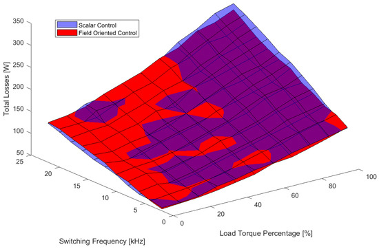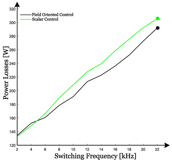 Figure 23 shows the relationship between total power losses and the switching frequency of the sPWM modulation technique for the SC and FOC schemes. Such analysis cannot be conducted for the MPC and DTC schemes because their working principle is independent of the switching frequency (unless the Notch filter implemented within the cost function of MPC is adapted). As shown, losses increase linearly as the frequency increases, which is consistent with Equation (2). As presented in Figure 23, SC and FOC control schemes exhibit comparable switching losses at low switching frequencies, hence close to 5 kHz; for switching frequencies above 5 kHz, FOC exhibit a better performance in terms of switching losses compared to SC.