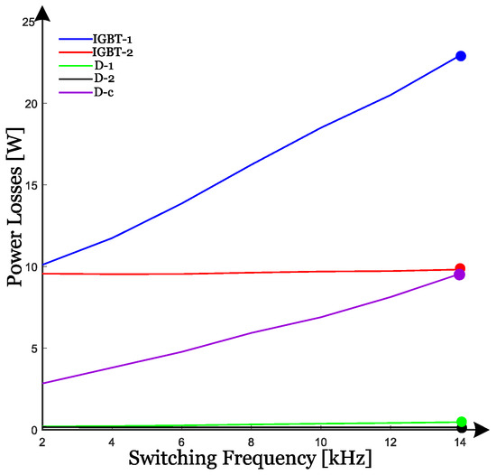 As stated previously, total losses are not symmetrically distributed within the power semiconductors in the 3L-NPC topology. This fact is due to the effect of the clamping diodes; thus, total losses on are higher than in , as shown in Figure 24. Switching device is more sensitive to the switching frequency compared to . Moreover, the commutation of clamping diode becomes more significant as the switching frequency increases. It should be noted that there is a specific point at which the losses of the clamping diode become equal to the losses of . Above this crossing frequency, losses of the clamping diode will overpass those of .