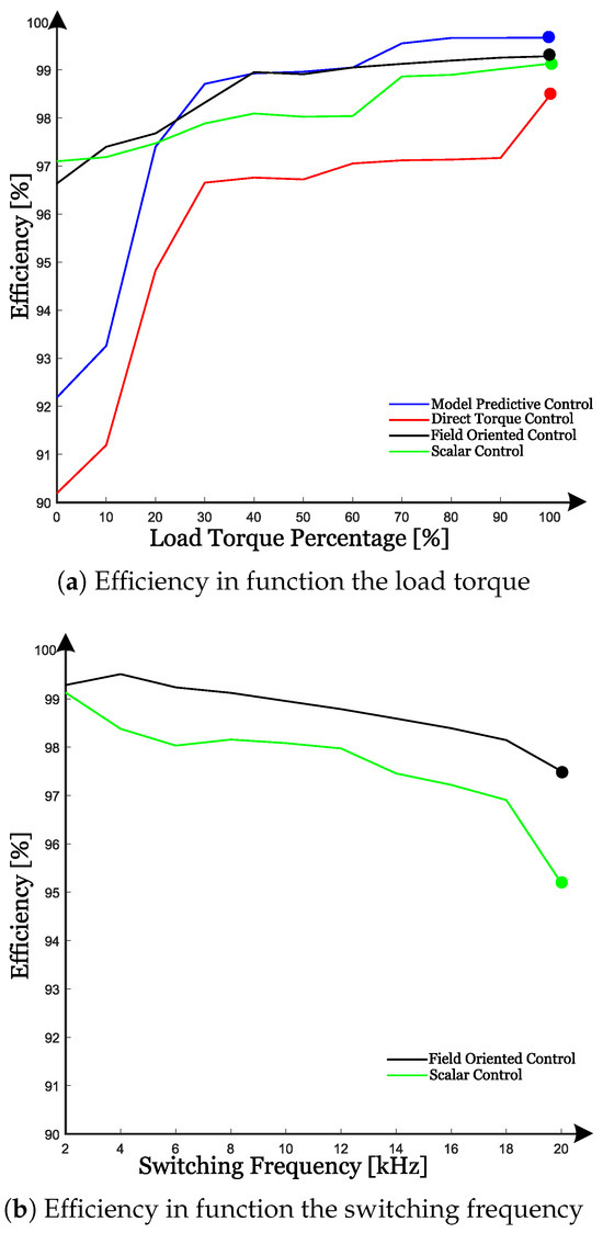 Switching losses are a key component in the total efficiency, which are highly dependent on the modulation strategy. In the case of scalar control and field-oriented control schemes, both are based on the use of linear controllers and a pulsed modulation (PWM) scheme, with a fixed carrier frequency, so switching losses are fixed to the PWM frequency. In this context, the efficiency of both control schemes appear to be similar for power ratings below the 60% load. However, above the 60% load, FOC presents a better performance in terms of losses compared to SC.