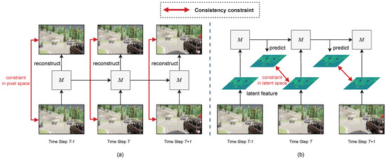 Comparison between mainstream world models and our approach. (a) Mainstream world models impose consistency constraints in high-dimensional and low-level pixel space, while (b) our model enforces constraints in low-dimensional and high-level latent space.