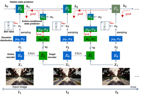 Our proposed world-modeling architecture for end-to-end autonomous driving. Mathematical symbols: denotes input RGB images at time t; represents encoded features; are mean and standard deviation parameters of state distributions (assumed to be Gaussian); is the stochastic state sampled from the state distribution; denotes latent states; and represent online and target encoders, respectively; is the hidden state predictor network, is the action-conditioned state predictor network; denotes driving actions; EMA indicates exponential moving average update of target encoder parameters; and grad shows gradient flow during training.