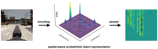 To analyze the characteristics of our learned spatial-aware state representations, we randomly selected eight samples and visualized their latent embeddings (formulated as Gaussian distributions in Equation (20)) as shown in Figure 5. Our visualizations show that the learned representations effectively capture essential features corresponding to observed objects. This indicates the interpretability of our representations—for instance, road structures are consistently visible across all samples in the latent space. In the first image, we can clearly observe the vehicle’s manifestation in the latent representation, while in the second image, when the vehicle disappears from view, its corresponding latent features also vanish accordingly. Similar phenomena can be observed in the third and fourth images, as well as in subsequent samples. Through this intuitive demonstration, we can appreciate both the potential of our learned representations in capturing environmental factors and their capability to enhance the interpretability of autonomous driving systems. Compared to methods like MILE [19] that represent states as flat vectors, our approach significantly reduces the model’s burden of learning spatial relationships. This allows the model to focus more on predicting future states rather than having to implicitly learn spatial encoding, ultimately leading to better environmental understanding.