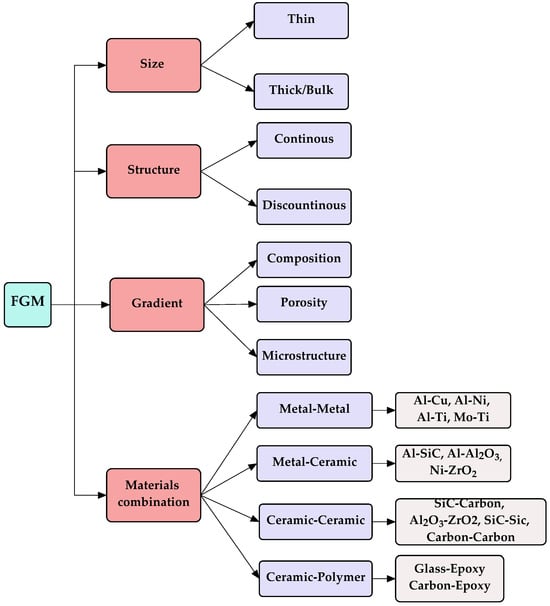 FGMs can be classified based on various characteristics, including size, structure, gradient type, and material combinations, as seen in Figure 1 and Figure 2.