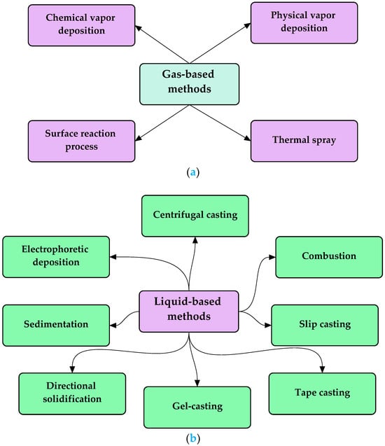 FGMs are produced using various fabrication techniques, which can be broadly classified into gas-based, liquid-based, and solid-based methods (see Figure 3). Each method offers unique advantages depending on the desired gradient structure and application, as shown in Table 1. On the other hand, there are limitations such as the growth patterns, the diverse types of materials that can be utilized due to ranked boundaries, structural considerations, constraint forces, and issues related to porosity [104].