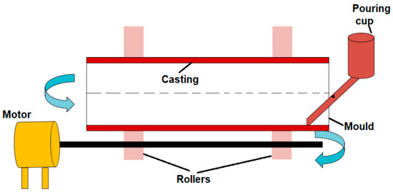 The gas-based methods rely on vapor-phase processing to deposit materials with graded properties. Chemical Vapor Deposition (CVD) and Physical Vapor Deposition (PVD), schematically presented in Figure 4, are common techniques where material layers are formed through chemical reactions or physical processes, respectively [104]. CVD deposits thin films via chemical reactions of precursor gases on a substrate, while PVD transfers material physically, using methods like sputtering or evaporation [24]. In addition, thermal spray techniques involve feedstock material melting in a combustion or plasma flame, flattening on the substrate, solidifying rapidly, and forming a deposit layer by layer [105]. These methods are particularly useful for producing thin films and coatings with precise gradients [106]. In contrast, the liquid-based methods utilize liquid-phase materials or suspensions to fabricate FGMs. Centrifugal casting (Figure 5) leverages centrifugal force to separate materials of varying densities, creating a gradient [21]. Techniques such as electrophoretic deposition (EPD) and sedimentation rely on particle movement in a liquid medium, driven by electric fields or gravity, to form graded layers. Directional solidification, gel-casting, slip-casting, and tape-casting provide additional flexibility for shaping FGMs by controlling solidification patterns or layering. Combustion synthesis, on the other hand, uses self-propagating high-temperature reactions to achieve compositional gradients.