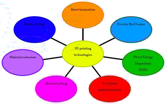 Several 3D printing methods (shown in Figure 6), including binder jetting, powder bed fusion, direct energy deposition (DED), vat photopolymerization, material jetting, material extrusion, and sheet lamination, have been utilized to produce FGMs.