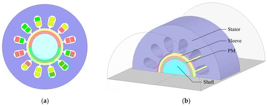 This study investigated the eddy current losses of an HSPMSM rotor sleeve at 10 kW and 30,000 rpm. The HSPMSM comprised a bipolar surface mount rotor structure with titanium alloy sleeves wrapped around the permanent magnets. The motor stator core in this study was composed of 0.2 mm thick B20AV1300 silicon steel sheets. Figure 1a shows the radial cross-section of a 10 kW, 30,000 rpm HSPMSM. The main parameters of the HSPMSM are shown in Table 1. To significantly reduce the computational scale of the 3D model, a half-model was employed, which is particularly advantageous for symmetric structures while simplifying both the boundary condition configuration and post-processing of results. Figure 1b illustrates the three-dimensional half-model of the motor.