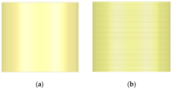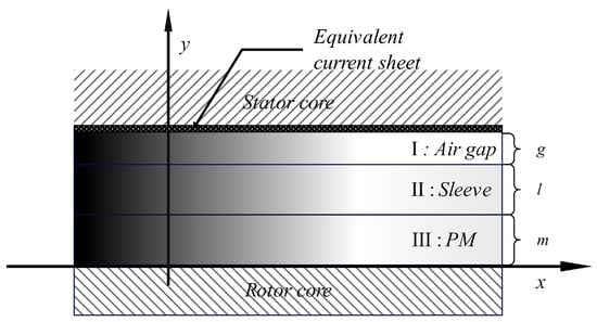 As shown in Figure 2, in the analytical model of this study, the x-axis corresponded to the circumferential direction and the y-axis to the radial direction. The computational domain comprised three layers: an air gap domain with thickness “g”, a sleeve domain with thickness “l”, and a permanent magnet domain with thickness “m”.