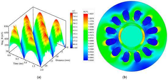 (a) Three-dimensional model radial air gap magnetic density; (b) magnetic flux density contour map of the stator core.