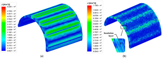 To achieve the precise simulation of eddy current losses in the laminated sleeve structure, a three-dimensional model was developed. The simulation compared two configurations: a monolithic sleeve configuration and an axially segmented laminated sleeve structure with 1 mm slices separated by 0.05 mm insulating layers. Figure 5 illustrates the eddy current density distributions for both configurations: Figure 5a displays the eddy current density distribution in the monolithic sleeve. Long, continuous eddy current paths were observed, resulting in significant circulating eddy currents within the material. Figure 5b shows the eddy current density distribution in the 1 mm axially laminated sleeve structure. In this configuration, the laminations effectively disrupted the eddy current circulation paths within the sleeve, and thus, confined the eddy currents to individual laminated layers and formed distinct stratified loops. As illustrated in Figure 5, the eddy current density of the laminated titanium alloy sleeve under rated operating conditions measured approximately 7.5 × 105 A/m2, representing a reduction of 2.95 × 106 A/m2 compared with conventional sleeves (3.7 × 106 A/m2), which is an approximately one order of magnitude decrease. Figure 6 demonstrates that the carbon fibre sleeve exhibited an eddy current density of 1.6 × 105 A/m2 under equivalent operating conditions, indicating that both sleeve types now operated within fundamentally comparable orders of magnitude regarding the eddy current density.