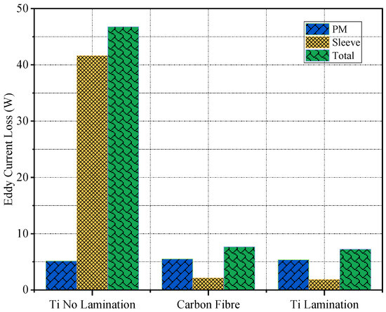Figure 7 illustrates the distribution of eddy current losses in the sleeve. Compared with the monolithic structure, the eddy current losses in the laminated structure were significantly suppressed. As evidenced by the comparison between Figure 7a,b, the total eddy current losses in the laminated configuration decreased by approximately one order of magnitude, averaging a reduction from 1.4 × 107 W/m3 to 1.1 × 106 W/m3. This demonstrates the effectiveness of the laminated structure in mitigating eddy current effects. Analytical calculations further validated the simulation results, as shown in Figure 8 and Table 3. The titanium alloy laminated sleeve (Ti Lamination) exhibited significant advantages in eddy current loss reduction compared with both the non-laminated titanium alloy sleeves (Ti No Lamination) and carbon fibre sleeves. The total eddy current losses in the conventional monolithic sleeves approached 50 W, whereas those in the Ti Lamination sleeves were reduced to less than 10 W. This confirms that the laminated design effectively suppressed the eddy currents in the sleeve, which substantially decreased the losses. The conclusions were verified: continuous conductive paths in the monolithic structures resulted in elevated eddy current losses, while the laminated structure confined the eddy currents to smaller loop circuits within individual slices, and thus, achieved a notable loss reduction.
