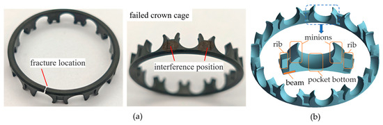 (a) Interference and fracture of the bearing cage (crown) of the motor drive system. (b) The structure of the crown cage (The blue dash square is the individual pocket of the cage).