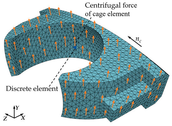 Centrifugal force is generated by the rotation of the cage itself, resulting in tensile stress along the circumferential direction and leading to deformation of the cage. To elucidate the relationship between centrifugal force and bearing speed, the concept of discretization is employed to divide the cage into N discrete elements, each small cube represents a particle within the cage as illustrated in Figure 2. The orange arrows indicate the direction of the centrifugal force acting on each particle as the cage rotates. When the cage rotates around the X-axis at a rotational speed of nc, the centrifugal force is oriented perpendicular to the direction of the linear velocity, each internal particle tends to be “thrown” in the radial (Y) direction, as illustrated in Figure 2.