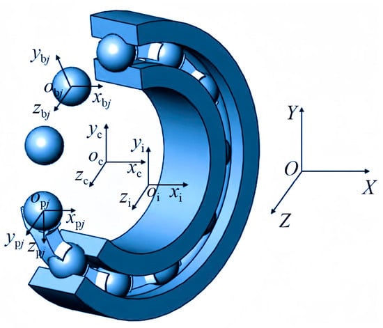 - The inertial coordinate system {O; X, Y, Z} is fixed in space, with its origin coinciding with the bearing center. The X-axis is aligned with the bearing axis, and the YOZ plane passes through the bearing center while remaining parallel to the bearing radial plane.