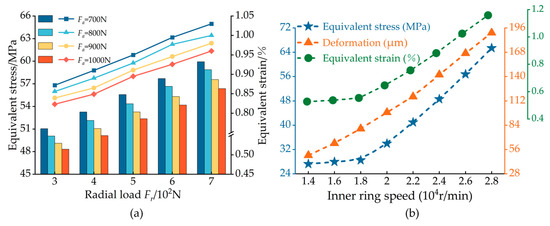 Within the time frame of 0 to 0.5 s, the Adams (2017 version) software was utilized to calculate the equivalent stress and strain of the cage under varying axial and radial loads. The maximum values of equivalent stress and strain for each working condition were subsequently extracted. It can be seen that increasing the radial load results in a corresponding increase in both the cage equivalent stress and strain from Figure 9a. Conversely, the increase in axial load causes the cage equivalent stress and strain to gradually decrease.