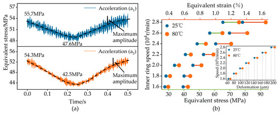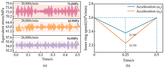Similarly to the speed simulation described in Section 2, the inner ring speed instantaneously increases from 0 to 16,000 rpm at the initial moment, leading to an unstable state of bearing motion. Consequently, the results of this process are omitted, with the analysis focusing on the acceleration and deceleration conditions illustrated in Figure 10b. Figure 11a illustrates that during the time interval from 0 to 0.25 s, the average equivalent stress of the cage decreases as the rotational speed diminishes. Conversely, from 0.25 to 0.5 s, the average equivalent stress increases in response to an increase in rotational speed. During the time interval of 0~0.25 s, the maximum stress calculated with an inner ring acceleration of a2 is slightly greater than a1. However, there is no significant difference in the maximum amplitude in the two accelerations.