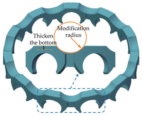 Increasing the pockets’ bottom thickness can enhance the cage strength and reduce the fractured risk. However, excessive thickness may impede the smooth operation of the cage and could potentially lead to interference in extreme cases. Therefore, determining the optimal pocket thickness is a critical factor in the cage strength design. As can be seen from Figure 12c, the optimal pocket bottom thickness is 2.4 mm. A schematic diagram illustrating the thickening of the pocket bottom is provided in Figure 13.