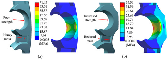 Cage and stress cloud diagram before and after structural design. (a) Before the cage structure design; (b) After the cage structure design.