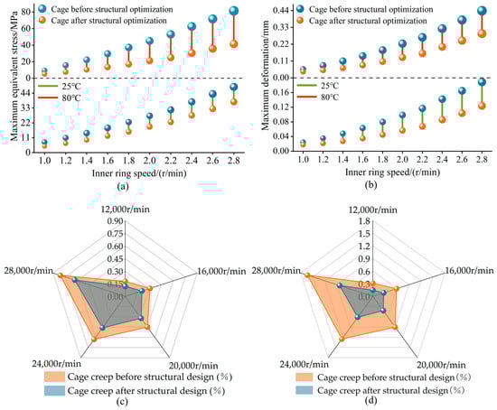 The strain of PA46 + GF30 materials is greatly influenced by both rotational speed and temperature. According to the bearing working parameters given in Table 1, the strain calculation of the two cages was carried out, which is illustrated in Figure 15c (25 °C) and Figure 15d (80 °C). It is evident that, at varying temperatures and rotational speeds, the cage strain of the cage after structural design is significantly lower. Additionally, as temperature and rotational speed rise, the disparity in strain between the two cages becomes increasingly pronounced.