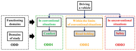 Then, the dynamic behavior of the vehicle must be analyzed for different scenarios relevant to the three operating domains of a vehicle (see Figure 2) (operational design domains: ODD), namely: ODD1—driving in conventional situations; ODD2—driving at the limit of conventional situations; and ODD3—driving in unconventional situations.