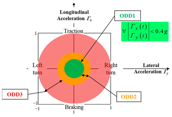 ODD1 is characterized by longitudinal Γx and lateral Γy accelerations of less than approximately 4 m/s2 absolute value (see Figure 3). This domain represents the majority of the time of use of a passenger vehicle [9,10].