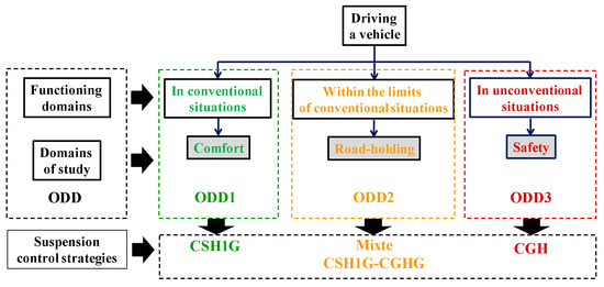 The first contribution of the authors in this paper concerns the division of the global operational domain (ODD) into three sub-domains relating to comfort (ODD1), road-holding (ODD2), and safety (ODD3). This division into three sub-domains results from an in-depth analysis of the overall dynamics of the vehicle, in particular using a 16-DOF simulator and different scenarios oriented towards comfort, road-holding, or emergency situations. Thus, based on information from the CAV’s proprioceptive and exteroceptive sensors, but also information from the infrastructure (V2X) and other vehicles (V2V), supervision makes it possible, at any time, to identify the ODD in which the vehicle is located and to propose the most appropriate strategy for suspension control.
