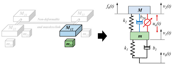 In fault mode (ua(t) = 0), the damping of the unsprung and sprung masses is ensured only by the dissipative element with the viscous friction coefficient noted as b20 (see Figure 6). The value of b20 is calculated so that in the event of a failure of the active suspension actuator, the vehicle can continue to drive safely until repaired, provided that it remains within ODD1. This fault mode is defined based on the expertise acquired during work with PSA concerning the Citroën Hydractive suspension, particularly in comfort mode (suspension in soft mode), where the wheel damping factor ζ1 = b20/(2 (m (k1 + k2))) is only 0.13, while this same factor is 0.35 in road handling mode (suspension in hard mode) [28].