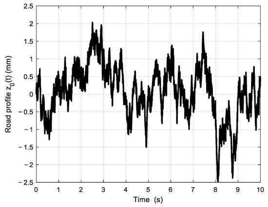 The International Organization for Standardization provides a method for describing and classifying road profiles based on the power spectral density (PSD) of the vertical displacement z0(t) of the road profile; this is the ISO 8608 standard [35]. This standard proposes a classification of road profiles from class A (motorway in very good condition) to class E (secondary road in very poor condition). From this data, it is possible to generate random road profiles with different geometric characteristics while belonging to a desired road profile class. Among the different existing methods to generate a random road profile [36], the method chosen in this article is the shaping filter method, with a band-limited white noise as input. In [36], full details for the generation of the ISO Class B road profile used in this paper are provided.