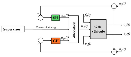 The regulation of v1(t) or a1(t) around zero is, in fact, only an intermediate objective, because the main objective of the GH strategy is to minimize the vertical variation fz(t) of the load Fz(t) on the wheel defined by: