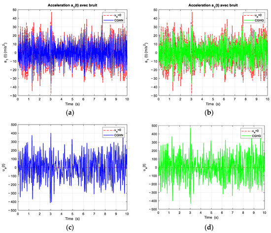 Figure 15 shows the time responses a1(t) ((a) and (b)) and ua(t) ((c) and (d)) obtained with the CGHN (in blue) and CGHG (in green) strategies, as well as with the fault mode (in red), and when the road profile applied is that of an ISO Class B road with Vx = 30 m/s (108 km/h).