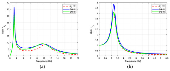 Gain diagrams of transfers (a) and (b) obtained with the CGHN (in blue) and CGHG (in green) strategies, as well as with the fault mode (in red).