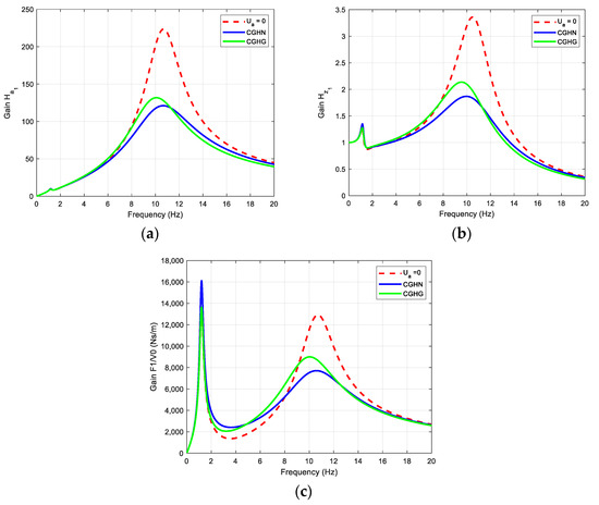 Figure 18 shows the gain diagrams of the transfers (a), (b), and (c) obtained with the CGHN (in blue) and CGHG (in green) strategies, as well as with fault mode (in red).