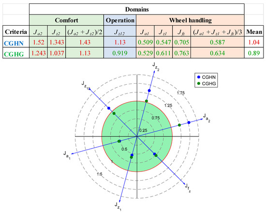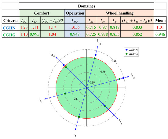 Figure 19 presents a table summarizing the values of the criteria Jx(bgh; ν1) for the two strategies CGHN and CGHG in the areas of comfort, operation, and wheel handling. In this table, all values above unity (degradation) are red, and all values below unity (improvement) are green. The numerical values that appear in the Mean column are equal to the sum of the values of the six Jx components divided by 6. To facilitate analysis, this table is accompanied by a radar plot.
