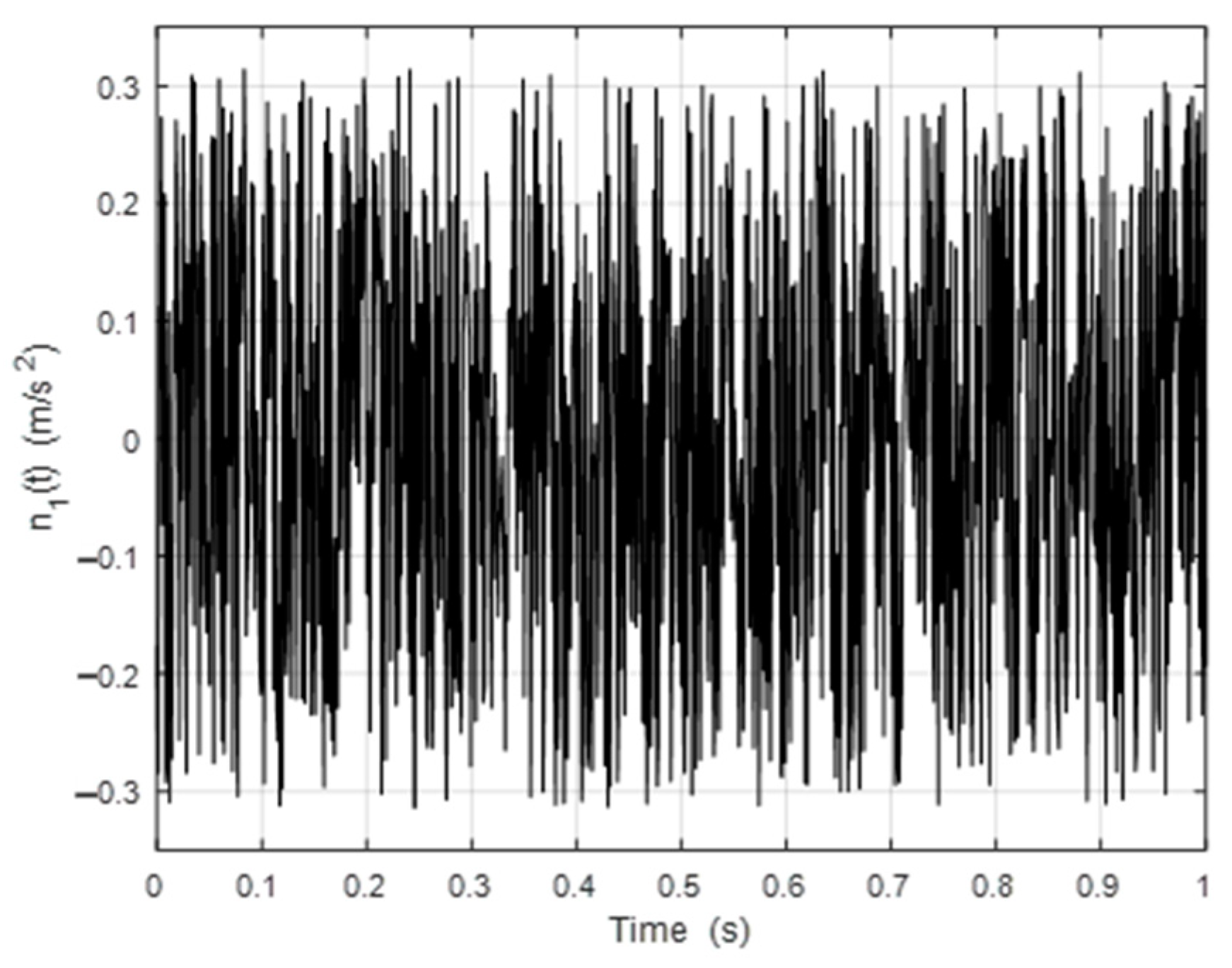 Evolution of the measurement noise n1(t) (in m/s2) from the Simulink “Uniform Random Number” model centered around zero with the limits B1min = −0.3145 m/s2 et B1max = 0.3145 m/s2.