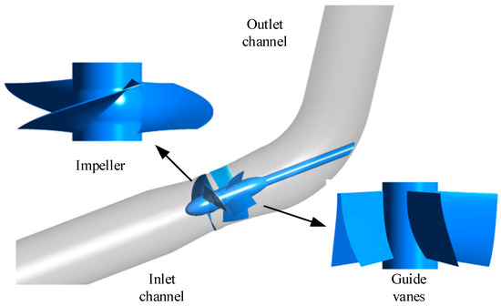 The hydraulic components of the original specific speed axial pump under study include the inlet channel, impeller, guide vanes, and outlet channel as shown in Figure 1. Original Scheme is designed based on the standard model pump size, with an impeller diameter of 300 mm and a tip clearance of 0.2 mm. The impeller has three blades, while the guide vane has five blades. The impeller rotates at a speed n of 1450 r/min, with a designed flow rate Qdes of 350 L/s and a specific rotational speed ns of 1179.29 (ns = 3.65nQdes0.5/H0.75). In this study, the original axial flow pump is designated as Scheme 1. To design a pump size capable of covering the range required for small, medium, and large pumping stations, Schemes 2, 3, and 4 were derived by scaling up Scheme 1 by factors of 3, 5, and 10, respectively, while maintaining geometric similarity. The design flow rate and rotational speed for all four schemes adhere to the principle of equal head similarity. Detailed parameters for each scheme are provided in Table 1.