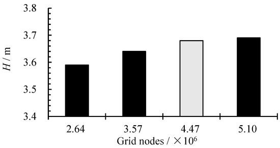 To accurately capture the internal flow field structure of the pump, all computational domains were discretized using structured hexahedral meshes. Figure 2 illustrates that all hydraulic components are discretized using hexahedral grids. The blade regions of the impeller and guide vanes were partitioned into an O-type mesh structure, with localized mesh refinement applied to enhance accuracy. Figure 3 presents the grid independence analysis. As illustrated in the figure, when the number of grids in the computational domain exceeds 4,469,203, the head exhibits significant changes, with further increases in grid density. Based on this analysis, the final number of grid nodes selected for each hydraulic component in the computational domain is as follows: 912,352 nodes in the outlet channel, 1,503,480 nodes in the guide vane, 1,369,620 nodes in the impeller, and 683,751 nodes in the inlet channel. The average Y+ values for the inlet channel, impeller, guide vanes, and outlet channel are 41.94, 20.59, 5.12, and 60.92, respectively. The distribution of Y+ values on the impeller and guide vanes is presented in Figure 4.