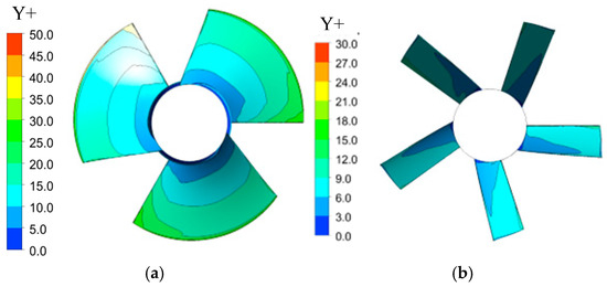 Y+ distribution of (a) impeller and (b) guide vanes.