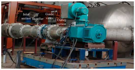 To verify the appropriateness of the numerical simulation boundary conditions and assess the accuracy of the simulation results, the external characteristic test for Scheme 1 was conducted on a closed hydraulic machinery test bench. As shown in Figure 5, the test bench is designed with a two-layer structure. The upper layer contains the JCL1 intelligent torque-speed sensor and the Yokogawa EJA intelligent differential pressure transmitter, which are utilized to measure power and head, respectively. The torque meter and differential pressure flowmeter have maximum measurement capacities of 200 N·m and 10 m, respectively. The lower layer is equipped with a German Krohne intelligent electromagnetic flowmeter for measuring the operating flow rate, with a maximum measurement capacity of 1800 m3/h. The measurement accuracies for power, head, and flow rate are better than 0.14%, 0.1%, and 0.2%, respectively. The overall measurement uncertainty of the test bench is determined by the combined uncertainties of these three instruments: .
