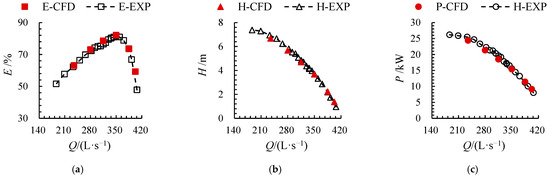 The external characteristic curves obtained from numerical simulation and experimental measurements are presented in Figure 6. As shown in the figure, the efficiency, head, and power curves derived from numerical simulations closely align with those from experimental measurements. The head and power curves decrease with increasing flow rate, with deviations between the simulated and measured values of 0.36% for head and 0.89% for power under the design operating condition. Since pump efficiency is directly proportional to head and inversely proportional to input power, the efficiency curve demonstrates a trend of initially increasing and then decreasing as the flow rate rises, with peak efficiency occurring at the design flow rate. At the design flow point, the deviation between the simulated and measured efficiency values is 0.53%. These results demonstrate a high level of agreement between the numerical simulations and experimental data, confirming the reliability of the computational results.