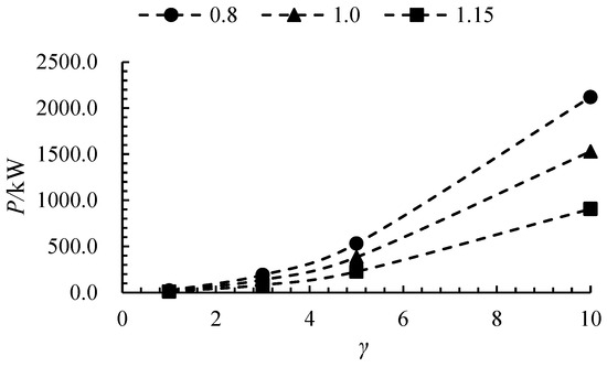 Figure 7 illustrates the power curves as a function of the size ratio (γ) at different flow rates. The input power of the axial flow pump increases with γ across all three flow rates. This is attributed to the increased inlet flow rate and enhanced water resistance as the pump size increases, requiring more power to overcome the resistance during impeller rotation. Notably, the power curve is non-linear, with a sharp upward trend observed when γ exceeds 5. At flow rates of 0.8Qdes, 1.0Qdes, and 1.15Qdes, the input power for γ = 10 increased by 9838.0%, 9853.8%, and 9824.0%, respectively, compared to γ = 1.