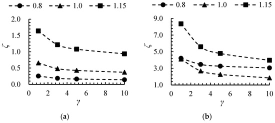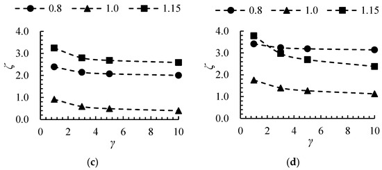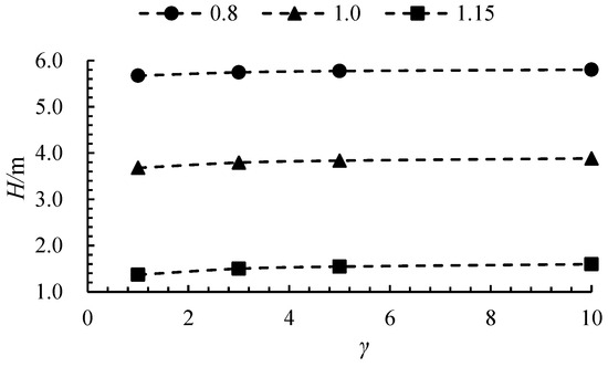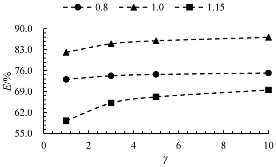Figure 8 presents the head curves as a function of γ at different flow rates. Since the design flow rate for each size ratio is calculated based on the equal head similarity law, the head curve does not exhibit a significant upward trend with increasing γ. At 0.8Qdes, 1.0Qdes, and 1.15Qdes, the head for γ = 10 increased by 2.3%, 5.6%, and 16.5%, respectively, compared to γ = 1. Figure 9 illustrates the efficiency curves as a function of γ across various flow rates. The efficiency exhibits a positive correlation with the size ratio, attributed to two primary factors: (1) the constant wall roughness results in a diminished wall viscosity effect as both the size and flow rate escalate, and (2) the impeller’s rotational speed declines with an increasing size ratio, thereby mitigating the centrifugal force effect. Nonetheless, the efficiency enhancement becomes less significant when γ surpasses 5. Specifically, at flow rates of 0.8 Qdes, 1.0 Qdes, and 1.15 Qdes, the efficiency for γ = 5 demonstrates increments of 2.3%, 4.7%, and 13.5%, respectively, relative to γ = 1. In contrast, the efficiency for γ = 10 only marginally improves by 0.7%, 1.3%, and 3.4% compared to γ = 5. This phenomenon is ascribed to the fact that augmenting the size elevates the operational flow rate of the axial flow pump, consequently attenuating both the centrifugal force effect and the wall effect.