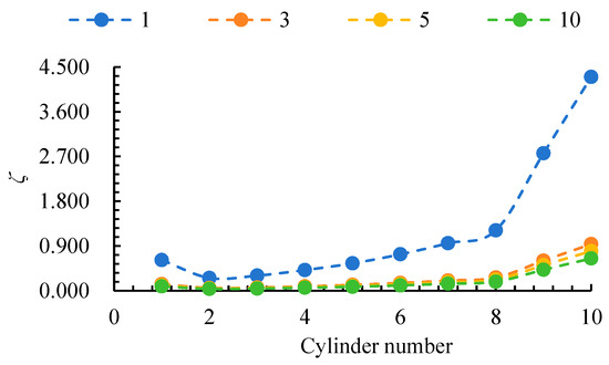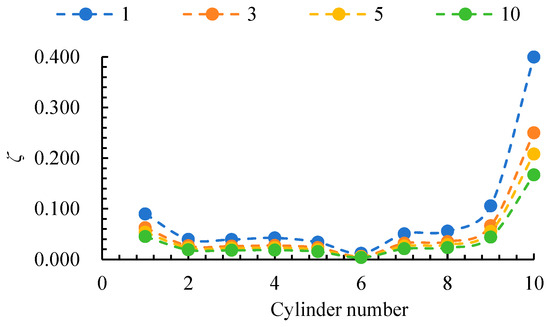 Similarly, the guide vane channel was divided into 10 cylindrical sections to study the radial distribution of EPC, as shown in Figure 13. Figure 14 shows that the EPC within the guide vane cylinders decreases and then increases along the radial direction, with the highest EPC observed near the rim due to high rotational kinetic energy and wall effects. Within cylinder 10, due to the increase in size ratio, the rotational kinetic energy and wall effect weaken, resulting in a decrease in the local entropy production coefficient as the size ratio increases. As the size ratio increases, the EPC decreases, with a 58.19% reduction observed for γ = 10 compared to γ = 1.