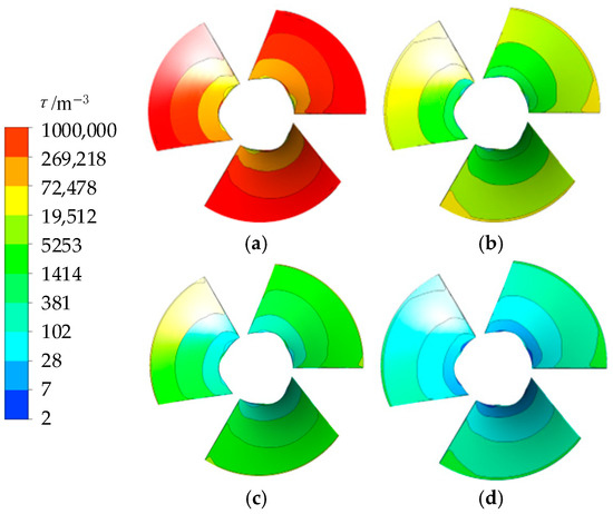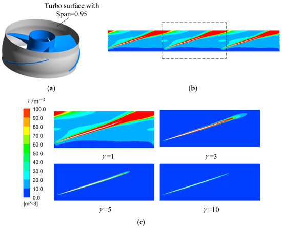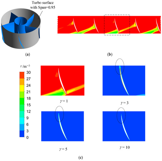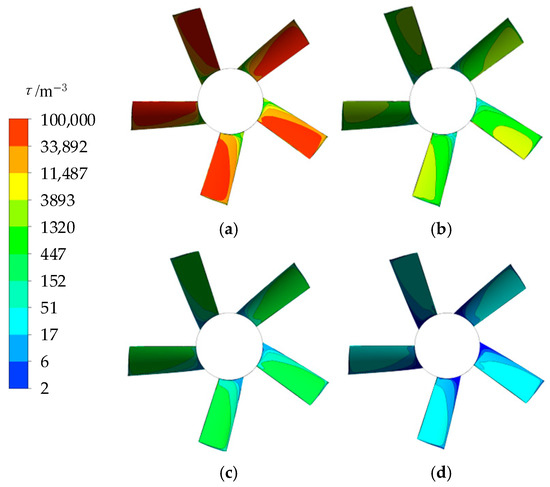 Spatial distribution of local entropy production coefficient of pressure side of impeller with (a) γ = 1, (b) γ = 3, (c) γ = 5, and (d) γ = 10 at 1.0 Qdes.
