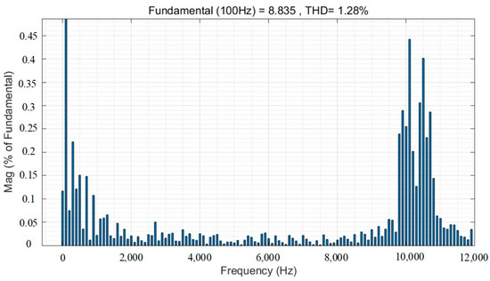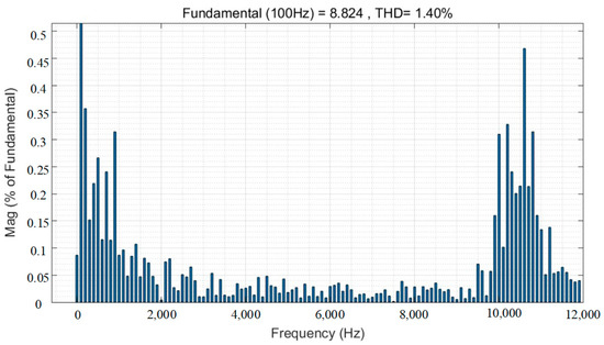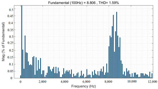 Figure 2, Figure 3, Figure 4 and Figure 5 show the results of the FFT analysis of the motor current for varying carrier frequency bandwidths when the switching frequency is 10 kHz. It should be emphasized that the fundamental current value is located at the top of Figure 2, Figure 3, Figure 4, Figure 5, Figure 6, Figure 7, Figure 8 and Figure 9, and the unit is A. The amplitude of the fundamental current is considered as 100%. The y-axis represents the percentage of harmonic current relative to the fundamental current. THD means the total harmonic distortion of the current.