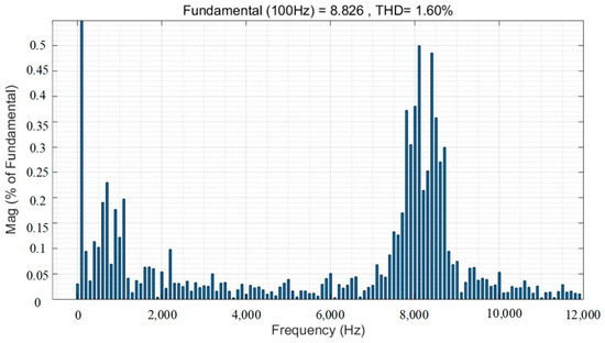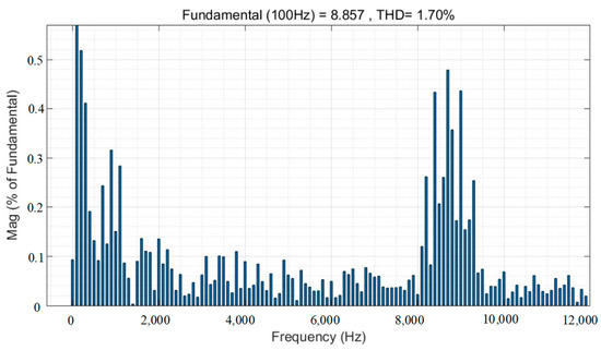 It can be seen from Figure 6, Figure 7, Figure 8 and Figure 9 that the harmonic amplitudes at the switching frequency are suppressed with the addition of the random carrier, and the suppression is relatively the best at = 1 kHz, where the harmonic amplitude as a percentage of the fundamental amplitude is reduced from 0.7% to about 0.47%. Meanwhile, the THD of current harmonics changes very little from 1.57% to 1.59% at from 0 to 1 kHz, and then THD becomes larger, reaching 1.70% at = 1.5 kHz.