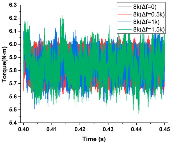 Harmonic voltages and currents generated by the inverter supply can induce distortions in the magnetic field within the air gap of the motor. This distortion can result in increased torque pulsations, subsequently leading to heightened motor vibration. Consequently, it is essential to analyze the torque variations across different random frequency ranges. Figure 10 illustrates the torque variation over time for different values.