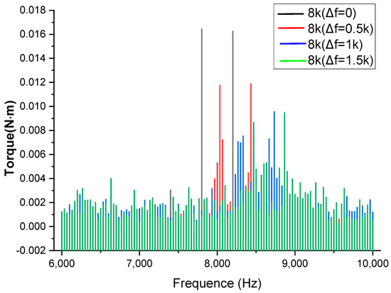 From Figure 10, it is evident that the torque pulsation gradually increases with the widening of the frequency . To further analyze the impact of variations on the torque ripple, an FFT analysis is performed on the torque. The segments corresponding to the switching frequencies within the 6 kHz to 10 kHz range are extracted from the FFT results, as illustrated in Figure 11.
