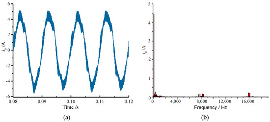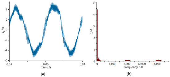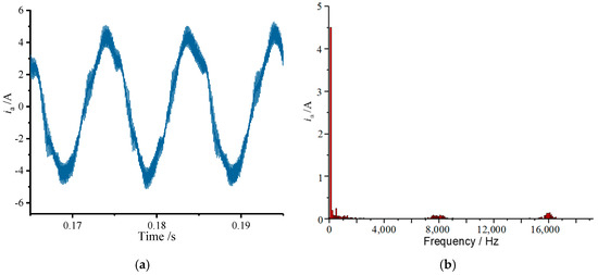 Figure 13, Figure 14 and Figure 15 show the current waveforms under the conventional control scheme, PPWM, and RPWM, respectively. From Figure 13, it can be seen that in addition to the high-frequency harmonics brought by the inverter, the experimental motor itself also carries some low harmonics, and although the low current harmonics will cause low-frequency noise, the narrow bandwidth of high-frequency current harmonics near the carrier frequency and its integer multiples, caused by the vibration of the motor, will produce a narrow-band noise that is very sensitive to the human ear.