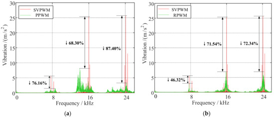 It can be clearly seen from Figure 16a that the higher amplitude harmonic components of the radial vibration acceleration are still mainly concentrated near the carrier frequency fc and its integer multiple frequency mfc (m ≥ 2), which is very similar to the FFT results of the current. The high-frequency harmonics of the current give rise to the high-frequency harmonic components of the radial vibration acceleration, which will cause intolerable high-frequency noise. For the high-frequency harmonic components with a narrow bandwidth, the amplitude of the radial vibration acceleration of these components is attenuated by more than 75% around the carrier frequency fc, by more than 65% around the carrier frequency 2fc, and by more than 85% around the carrier frequency 3fc for all the operating conditions using the PPWM technique.